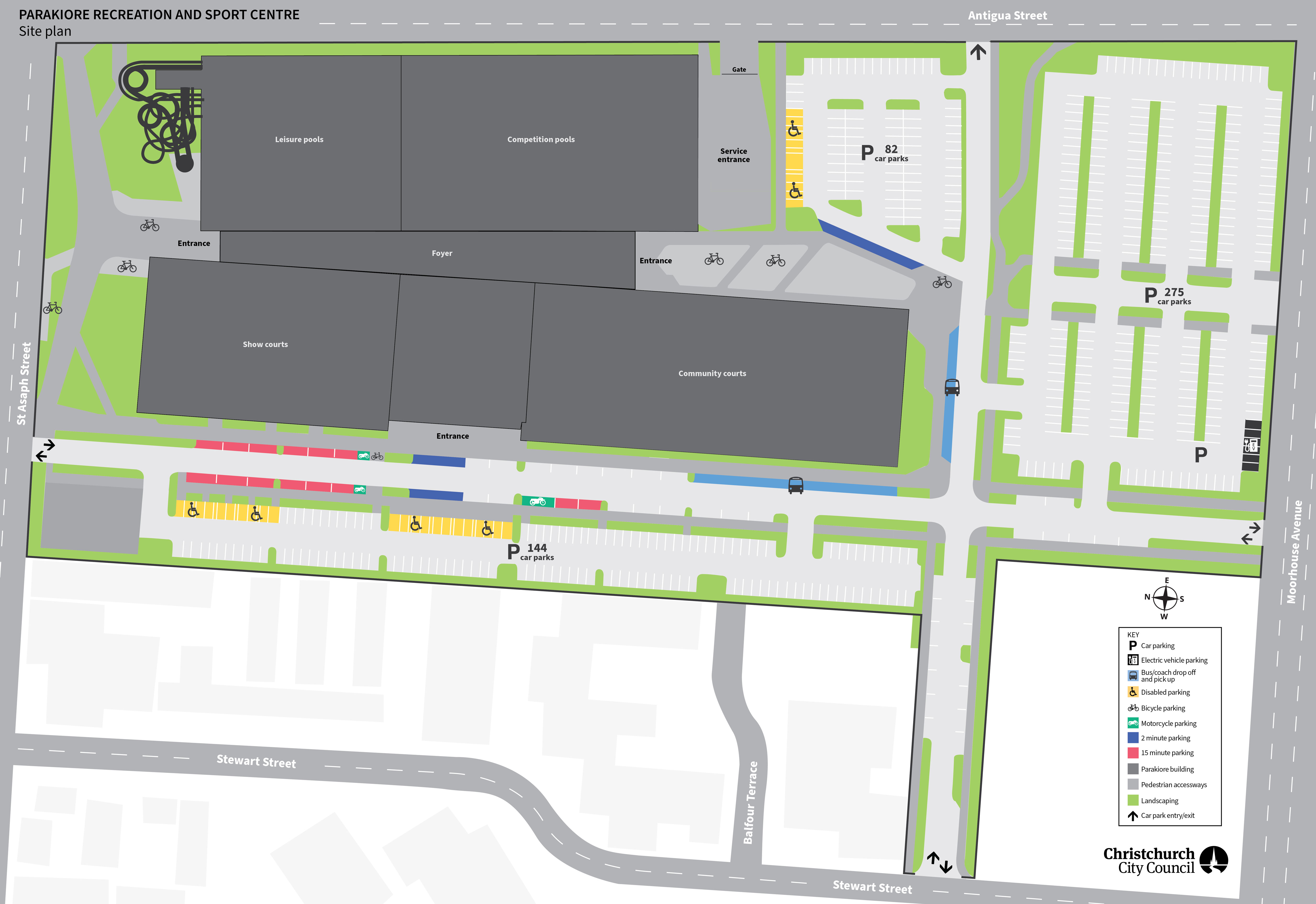 Parakiore is well connected to the city’s network of cycleways. The Quarryman’s Trail cycleway passes Parakiore on Antigua St. There are over 150 cycle parks provided for our customers. These are located near each of the entrances. Check out your best route on the online cycle map.